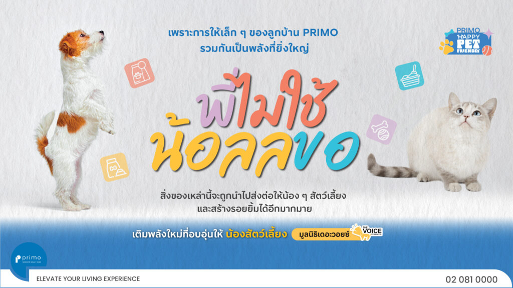 โครงการ “ พรีโม พี่ไม่ใช่ น้อลลขอ ” ส่งต่อความห่วงใยเพื่อสัตว์จร และสัตว์ด้อยโอกาส เพราะ ในสังคมปัจจุบัน สัตว์เลี้ยงไม่ได้เป็นเพียงแค่ “สัตว์” อีกต่อไป แต่กลายเป็นสมาชิกที่สำคัญของครอบครัว และยังมีสัตว์อีกจำนวนไม่น้อยที่ยังคงขาดแคลนทั้งอาหาร ยารักษาโรค และของใช้จำเป็นต่าง ๆ เพื่อให้พวกเขามีชีวิตที่ดีขึ้น บริษัท พรีโม เซอร์วิส โซลูชั่น จำกัด (มหาชน) จึงได้จัดโครงการนี้ขึ้นมา เพื่อเป็นสะพานแห่งการส่งต่อความห่วงใยจากคนใจดีสู่สัตว์ที่ต้องการความช่วยเหลือ